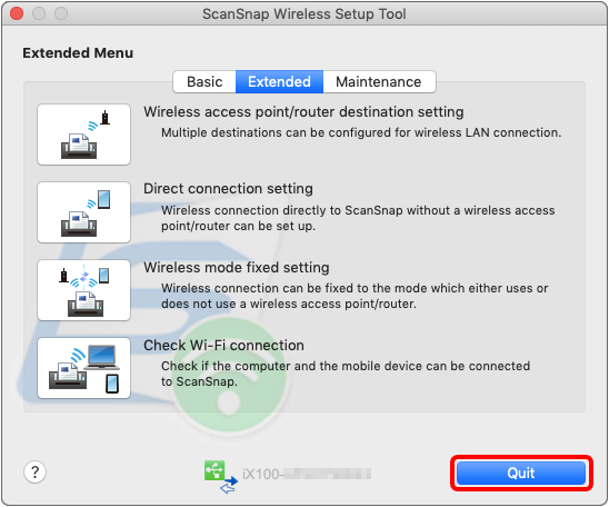 To stabilize the Wi-Fi (access point) connection for the iX100, set the [ScanSnap Wireless Setup Tool] to [Access Point Connect mode].